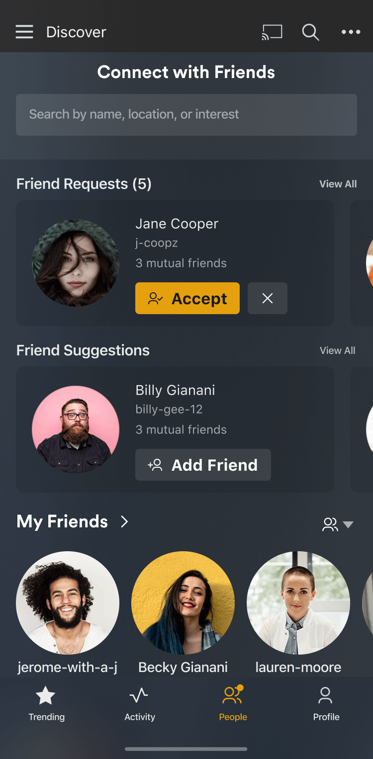 Where you can search for and add friends. We’ll add some suggestions too. The more friends you add, the more you’ll discover!